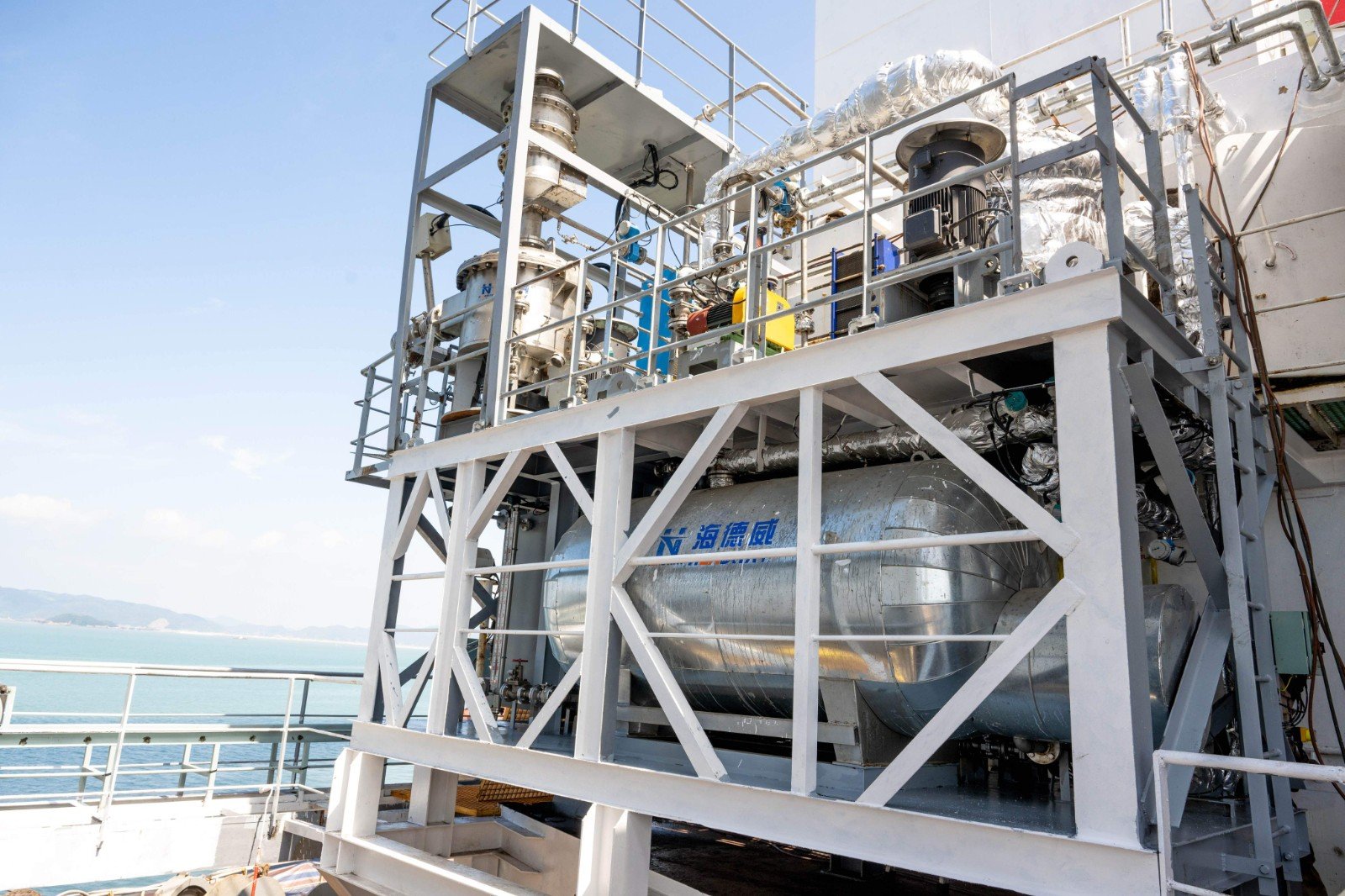 海洋衛士?船載碳捕集系統依托海德威自主設計的高速離心脫碳技術和高性能吸收劑,以高速旋轉形成的離心力場替代傳統重力場,顯著提升了氣液兩相傳質效率,系統脫碳效率超過90%,二氧化碳捕集純度可達99.6%以上,具有脫碳效率高、體積小、能耗低、安裝及儲運便捷等優勢。
